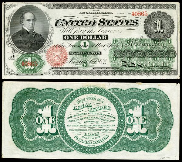 До 1861 года США фактически не имели единой банкнотной системы. Большинство денежных операций осуществлялось через частные банки или через «звонкую монету» (в этом случае под этот термин попадают также золотые и серебряные слитки). Временные быстровыкупаемые облигации «Treasury Notes», выпускаемые Казначейством США в 1793—1861 гг., полноценными банкнотами считать нельзя. После начала Гражданской войны обеим враждующим сторонам потребовались гигантские суммы денег. 17 июля 1861 года Конгресс США принял акт, обязывающий казначейство выпустить новые денежные знаки на астрономическую по тем временам сумму — 60 млн долларов.[23] Заказ был направлен в нью-йоркскую печатную компанию «American Bank Note Co.» Учитывая, что акт 17 июля санкционировал выпуск только номиналов 5, 10 и 20 долларов, можно представить, какое огромное количество банкнот пришлось изготовить. Печатники подошли к делу с чисто практической стороны: они проверили, прежде всего, запасы краски на складах и выяснили, что больше всего зелёной.