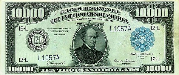 - Глава Министерства Финансов во время правления президента Линкольна, а впоследствии глава Верховного Суда США Салмон Чейз (англ. Salmon Chase) — на банкноте в 10000 долларов. Салмон Чейз первым распорядился поместить на американских деньгах надпись In God We Trust (с англ. — «Мы верим в Бога»[9]) — её начали чеканить на монетах достоинством 2 цента в 1864 году. На бумажных долларах она появилась в 1957 году, а с 1963 года используется постоянно. Любопытно, что первая банкнота достоинством 1 доллар, выпущенная в 1863 году, содержала не изображение Джорджа Вашингтона, а портрет Салмона Чейза (банкнота в 10 000 долларов уже не выпускается, но >100 шт. всё ещё находятся в обращении и являются законными платёжными средствами).