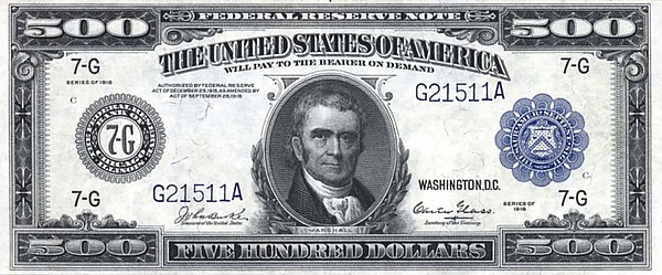 - Председатель Верховного Суда США Джон Маршалл (англ. John Marshall) — на банкноте в 500 долларов 1918 года.