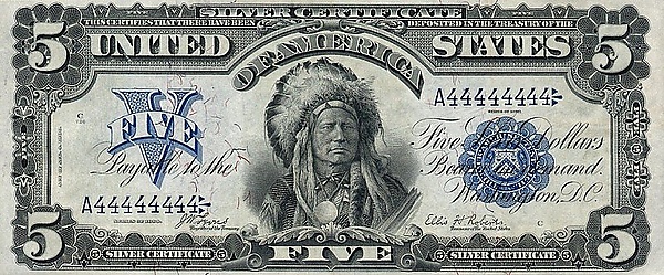- 16-й президент США, победитель в войне Севера и Юга, Авраам Линкольн (англ. Abraham Lincoln) — на банкноте в 5 долларов.