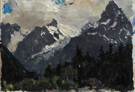 На картине представлен горный пейзаж: на фоне бледно-серого неба возвышаются бурые горы, вершины которых покрыты снегом. У подножия гор простирается лес. В правой части полотна, согласно композиции, изображён крупный каменный валун.