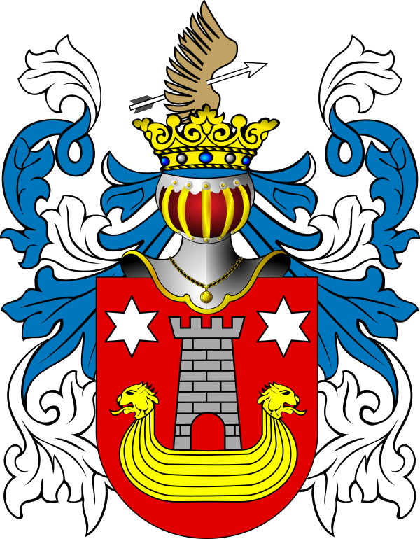 В вершине шлема левое коршуново крыло, проткнутое серебряной стрелой влево. Намёт голубой с серебряным подбоем. Герб внесён в Гербовник дворянских родов Царства Польского, часть 1, стр. 212.