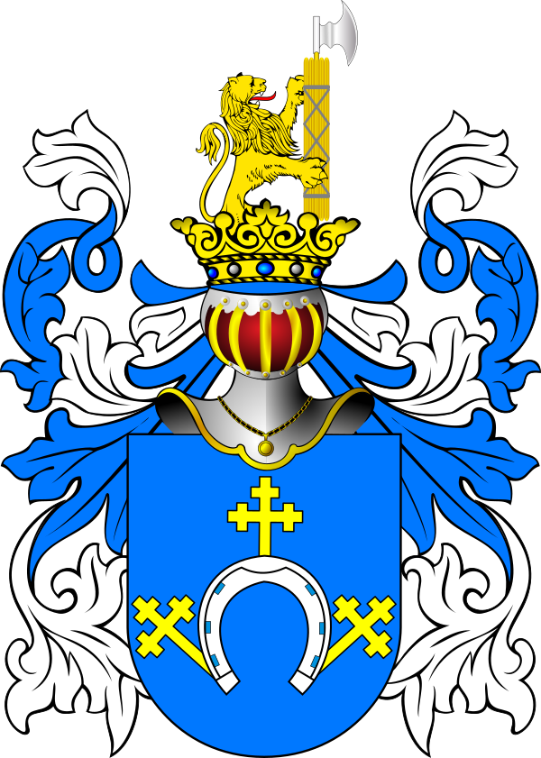 В вершине шлема золотой лев, влево, с ликторским пуком в лапах. Намёт голубой с серебряным подбоем. Герб внесён в Гербовник дворянских родов Царства Польского, часть 1, стр. 211.