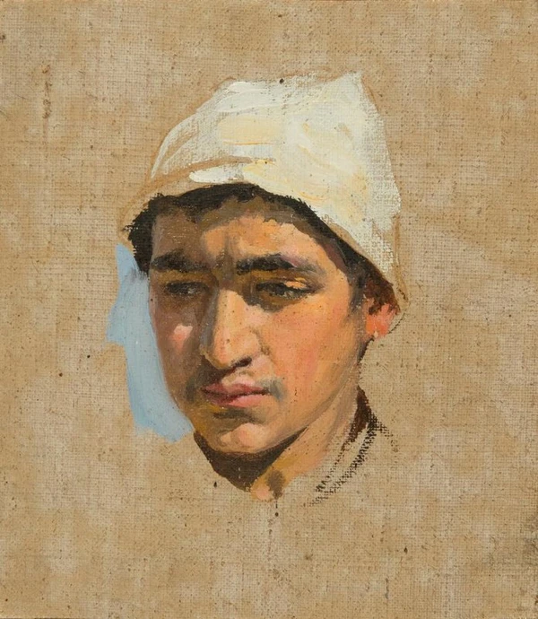 На этюде изображена голова юноши с небольшим поворотом влево на фоне белого грунта, слегка подцвеченного жёлтым. Из-под белой шапочки видны чёрные волосы, выделяются густые чёрные брови и небольшие усики. Справа у шеи намечен контур воротника, слева у шеи присутствует голубой мазок.