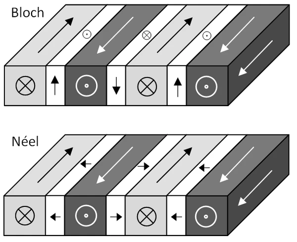 Классификация доменных стенок производится в зависимости от способа поворота вектора намагниченности внутри доменной стенки, а также от симметрии кристалла. К первому типу относятся доменные стенки типа Блоха и Нееля. Стенки второго типа имеют в названии указание угла, на который изменяется направление намагниченности в соседних доменах. Согласно второй классификации стенки Блоха и Нееля являются 180°-ми, то есть, соседние домены имеют антипараллельные векторы намагниченности[3].