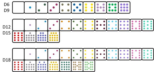 Классическое домино, содержащее 190 костей с набором точек или цифр от 0 до 18.