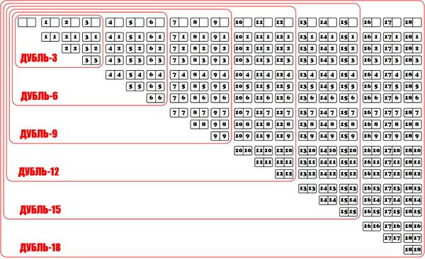 - При суммировании концов, имеющих дубли, номиналы дублей суммируются (0-0=0; 1-1=2; 2-2=4;… 6-6=12).