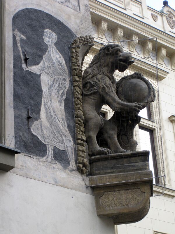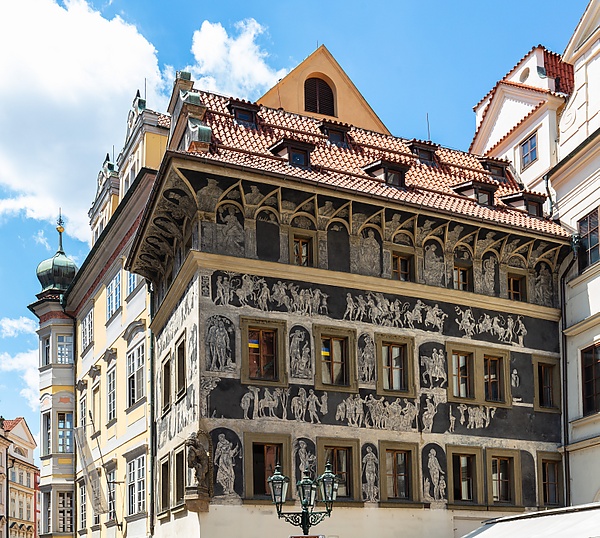 Дом был построен как позднеготическое здание в первой половине XV века. Он был довольно маленьким, с небольшим двором и имел два этажа. В 1430 году к нему была присоединена часть соседнего дома. В период до 1564 года были пристроен третий этаж снизу с полосой люнет. Орнаменты-сграффито создавались в два этапа — до 1600 года и до 1615 года. Во время барочной реконструкции они были удалены, но восстановлены в 1920-х годах. На них представлены библейские сцены вместе со сценами из античной Греции и эпохи Ренессанса.
