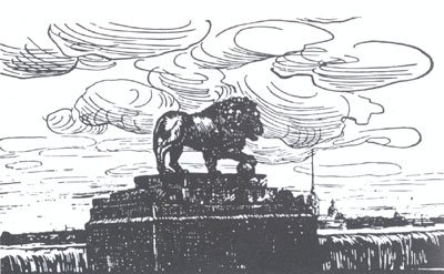 Иллюстрации к поэме «Медный всадник»: сверху А. Н. Бенуа (1899—1905), снизу А. П. Остроумовой-Лебедевой (1901, изображён лев из другой известной пары).