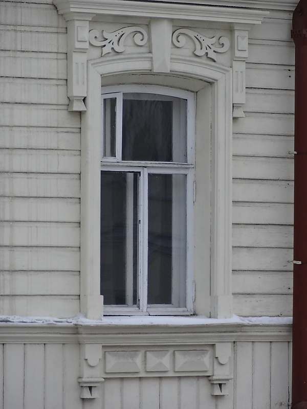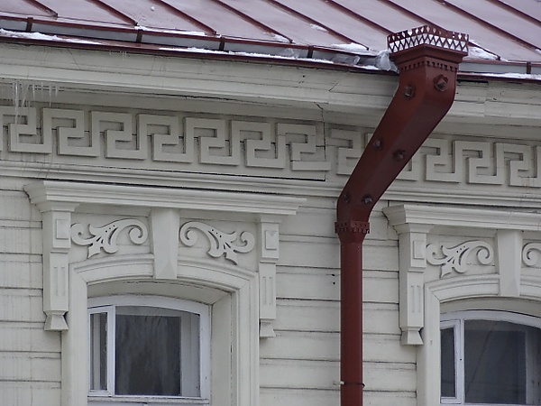 Двухэтажный, Г-образным в плане, дом с главным западным фасадом с нечётным числом окон и с центральным балконом второго этажа с ажурной металлической оградой. Дом с нарушенной симметрией фасада за счёт смещения главного входа в право, центральный вход выполнен в форме портала с массивными пилястрами дверью. Каменные стены и углы первого этажа дома рустованы лопатками, а деревянные стены второго этажа дома обшиты тёсом, поверх которого пропущен пояс меандра. Окна первого этажа декорированы штукатурными наличниками, а второго — деревянными наличниками с сандриками. Северный фасад выполнен аналогично. Внутри дома имеется деревянная лестница, расположенная в южной части[1].