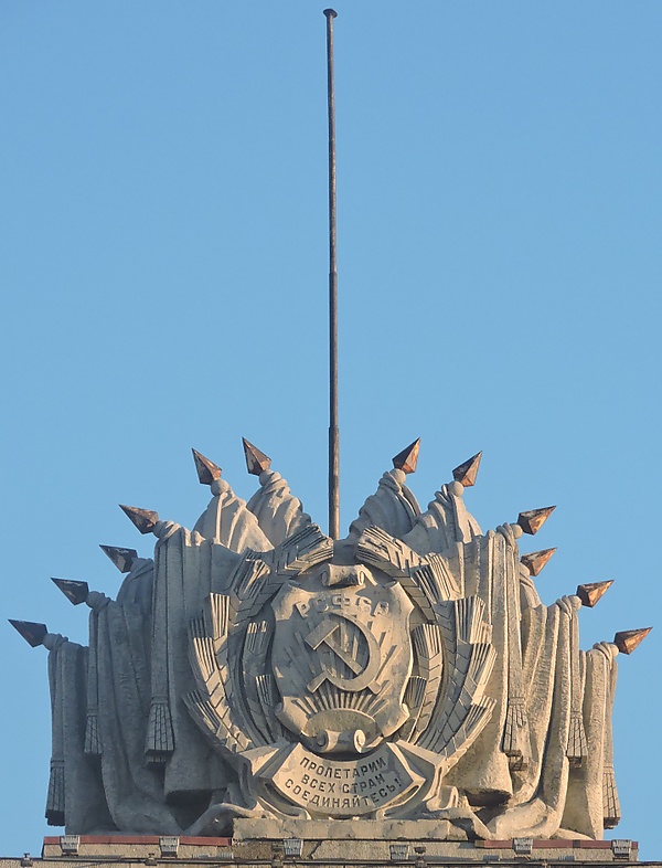 Центральная восьмиэтажная часть здания: четырнадцатиколонный портик, завершённый скульптурной группой на тему социалистического строительства (скульптор Н. В. Томский) и гербом СССР (скульптор И. В. Крестовский).