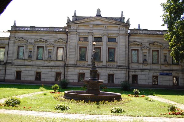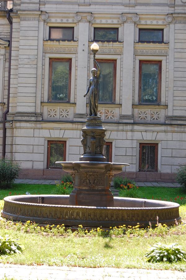 Восточное крыло особняка Стахеев отвёл под галерею своей коллекции картин. В западном размещалась контора. Дом отстоит от красной линии улицы, перед ним разбита лужайка. В её центре установлен фонтан «Богиня ночи» (действующий и сейчас), увенчанный чугунной скульптурой девушки с электрическим светильником в руке. Фигура изготовлена в конце XIX века парижскими мастерами. Установленные на главном фасаде в нишах второго этажа фонари и скульптура «Богиня плодородия» напротив окна зимнего сада также произведены в Париже. За особняком имелся большой сад, на территории которого был устроен руинный грот «Бельведер»[2].