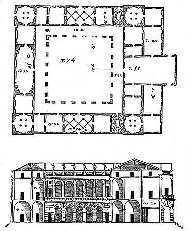 Строго симметричный, лишённый входных дверей фасад по Спиридоновке практически буквально воспроизводит рисунок фасада палаццо Тьене, выстроенного Андреа Палладио в Виченце в 1542—1553 годы[1][6]. Единственное изменение копии относительно прототипа — увеличенная высота первого этажа. Следуя пропорциям венецианского Дворца дожей, Жолтовский сделал первый этаж на 1/13 более высоким, чем второй — таким образом верхний этаж воспринимается облегчённым относительно массивного первого этажа. Как и почему Жолтовский выбрал за образец фасадов палаццо Тьене — осталось неизвестным[6]. Из множества построек Палладио в Виченце палаццо Тьене — «наименее палладианское по стилю здание», тяготеющее скорее к архитектуре Рима и Мантуи (вероятно, Палладио строил палаццо Тьене под влиянием работ Джулио Романо из Мантуи)[6]. Копирование европейского оригинала, само по себе, было для Москвы чуждо[6] и непривычно: московские архитекторы предреволюционных лет опирались не на европейское наследие Ренессанса, а на проверенные петербуржской практикой неоренессансные адаптации М. М. Перетятковича и М. С. Лялевича[7].