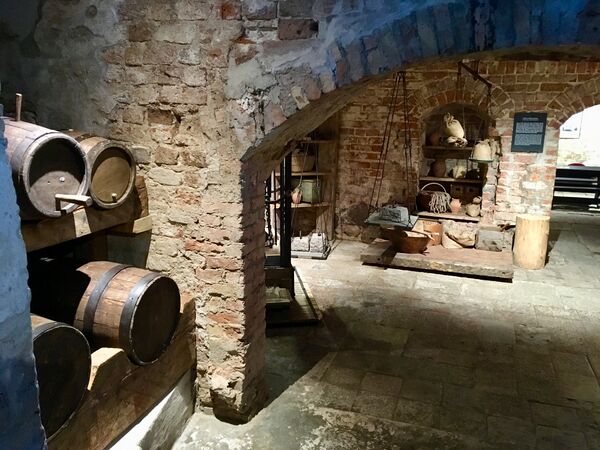 Исторические погреба, построенные в 1334 году, — единственная сохранившаяся в оригинале историческая часть дома. Изначально их использовали как складские помещения. Здесь хранили запасы вина и привезённые торговцами товары: зерно, лён, мёд, воск. Сегодня тут можно увидеть настоящую римскую печь, с помощью которой обогревали дом в холодное время года, а также обстановку средневековых складов с соответствующей атрибутикой (весы).