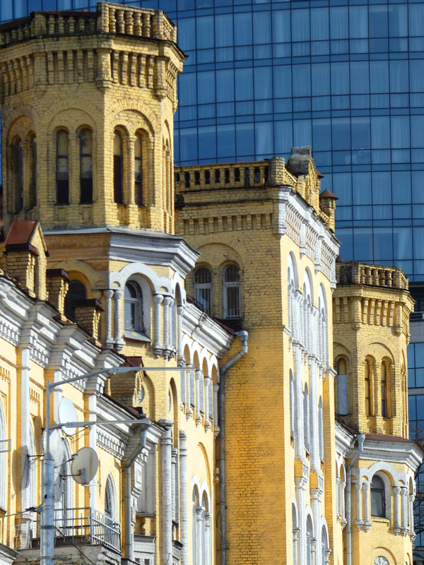 После завершения строительства Новой киевской крепости желтый киевский кирпич начали использовать для гражданских зданий. В 1870-х годах появились дома без штукатурки с чистым кирпичным фасадом, первым из которых стал отель «Националь» на Бессарабке, построенный архитектором Владимиром Николаевым в 1870 году (не сохранился). Черты крепости просматриваются и в доходном доме аптекаря Фроммета. Чрезвычайно простая планировка сочетается с невероятно выразительным видом башен « английского готики»[3].