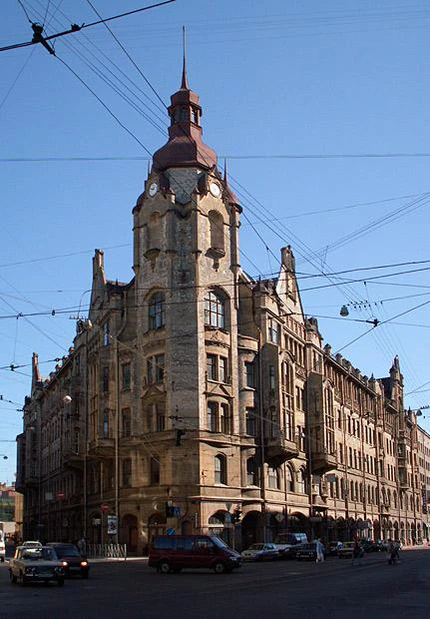 Фасады здания выполнены в стиле поздней эклектики — историзма, являются образцами явной ретроспекции[28], в связи с чем в архитектуре дома совмещаются элементы модерна, готики (в первую очередь — её английского направления, чем напоминает Центральный Универсальный Магазин в Москве[28], русской псевдоготики), немецкого ренессанса[2], используются мотивы средневекового зодчества[29]. Тем не менее, несмотря на многочисленные стилизации, период, когда был возведён дом явно определяется. Декор представлен различными элементами: плетениями, фигурами грифонов, химер[28], сов (высота последних — 1,8 м[30][17][18]), чертополоха (высотой и шириной в 1 м[18]), пауков[31]. Фасад акцентирован ритмичной чередой башенок, щипцов, эркеров[29], окон в стиле модерн[28].