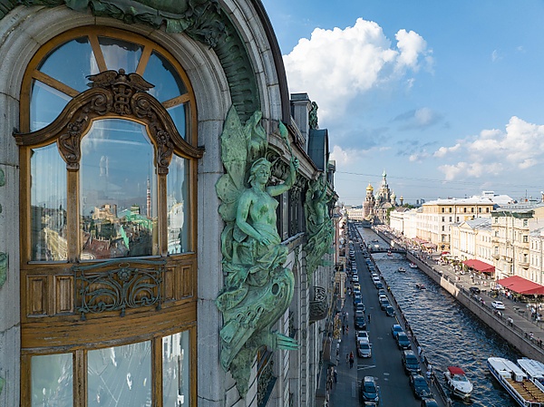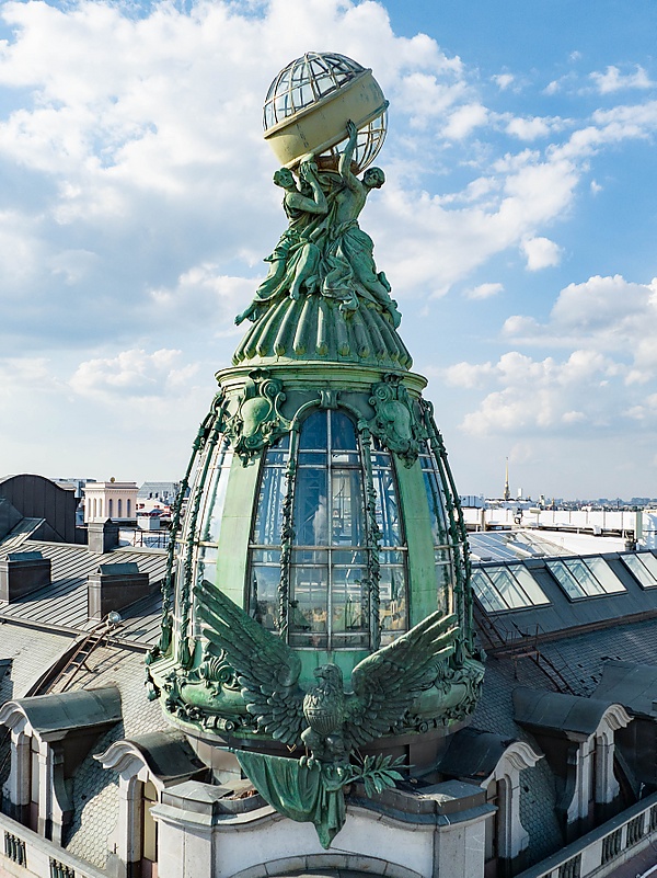 Архитектурной доминантой здания стала башня с куполом, увенчанным скульптурной композицией и стеклянным глобусом. Глобус опоясывала металлическая лента, на которой золотыми буквами было написано наименование «Зингер», символизируя распространение продукции компании на весь мир. Купол сориентировали по линии Пулковского меридиана. Композиция стилистически рифмовалась с башней Городской Думы и шатрами Спаса на Крови[3][2].