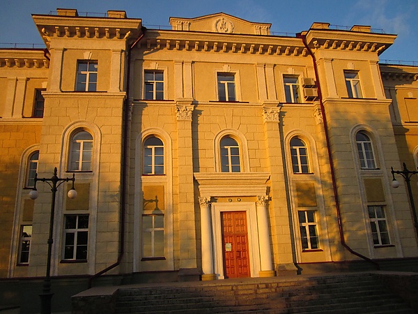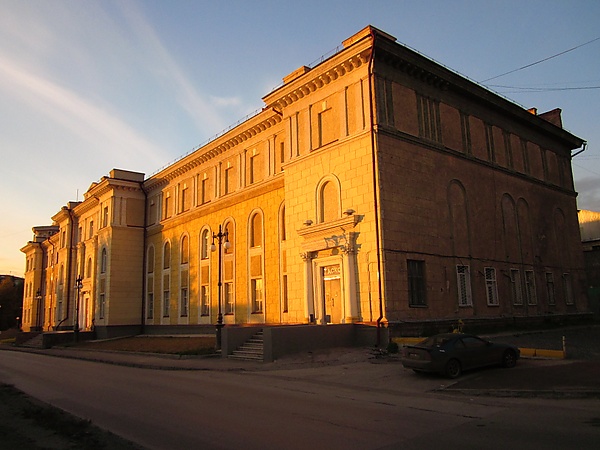 Здание Г-образной формы. Южный фасад здания ориентирован на Зыряновскую улицу, западный — на улицу Добролюбова[1].