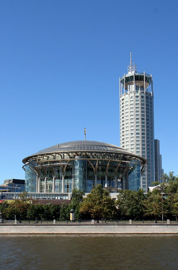 На куполе здания расположена эмблема с изображением скрипичного ключа высотой 9,5 метров и массой более 6 тонн (автор — Зураб Церетели). Сложнейший роликовый механизм позволяет столь тяжёлой конструкции вращаться по принципу флюгера. Композиция выполнена из нержавеющей стали, её центр — ключ и листья — покрыт сусальным золотом. Флюгер был водружён на крышу здания с помощью вертолёта[2].
