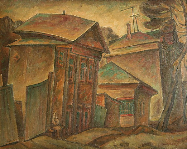 На картине представлен городской пейзаж, выполненный в жанре ведута. Центральным элементом композиции выступает уходящая вдаль улочка с покосившимися домами частного сектора, что подчёркивает глубину композиции и перспективу пространства. Цветовая гамма выдержана в приглушённых зеленовато-коричневых оттенках, создавая ощущение вечернего состояния. Возле крайнего слева дома изображена женщина в светлом платке, сидящая на лавочке, что придаёт сцене жанровую выразительность.