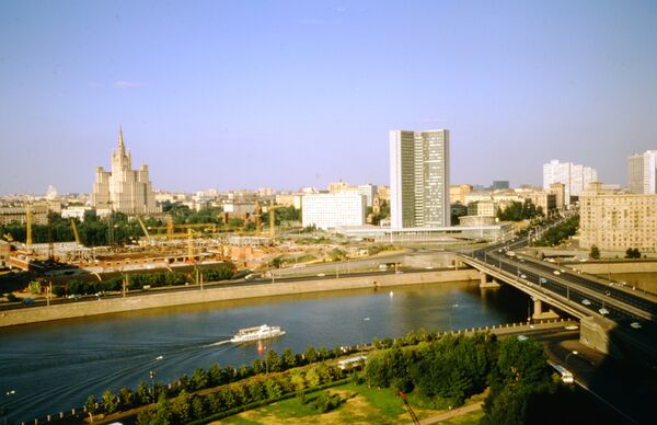 В 1965-м[2] для размещения административных органов РСФСР на этом месте началось строительство Дома Советов. План реконструкции территории подготовила группа архитекторов «Моспроект-1» под руководством Дмитрия Чечулина. В проекте принимали участие П. Штеллер, В. Лукьянов, В. Мазурин, А. Афанасьев, М. Арзрумцян, И. Чекалин, инженеры Н. Вишневский, Ю. Дыховичный, В. Филин, Б. Наумов, П. Симаков, В. Мастерков[5][6]. Изначально Чечулин предлагал для строительства Таганскую площадь, возвышающуюся над значительной частью города. Участок на Краснопресненской набережной был неудобным из-за близлежащей застройки. Но из-за хорошего вида на высокий берег Москвы-реки и будущий Дом Советов выбрали именно это место[7].