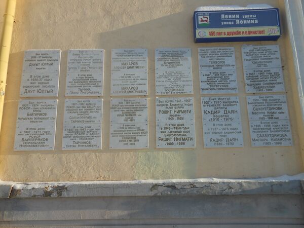 В разное время здесь проживали известные в городе и республике, заслуженные люди, о чём свидетельствуют мемориальные доски на фасаде. В частности в доме проживали заслуженный архитектор РСФСР, доктор искусствоведения Б. Г. Калимуллин, заслуженный архитектор РБ, нарком БАССР М. Н. Сахаутдинова, народный художник БАССР С. Д. Тавасиев, писатели Г. Г. Амиров и Д. Юлтый, заслуженный врач РСФСР Н. Н. Байтеряков, химик П. П. Будников, народные артисты Г. М. Мингажев, А. К. Мубаряков и Г. А. Мубарякова[12], поэты Рашит Нигмати, С. Г. Галимов и П. Г. Тычина[6], академик Г. С. Розенберг[13]. Большинство первых жителей дома стали жертвами сталинских репрессий 1930-х годов[8].