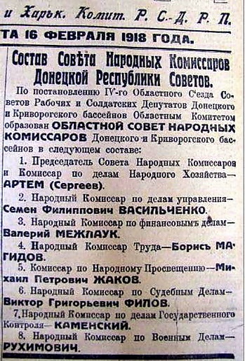 - Председатель Совета народных комиссаров — Артём (Ф. А. Сергеев).