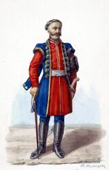 - ↑ Перемены в обмундировании…, 1857—1881, Илл. 381. Казак Донского Войска и Обер-Офицер Донской Конно-Артиллерийской № 2 батареи, 30 мая 1862. (В городской парадной форме)..