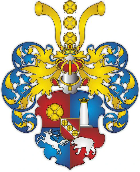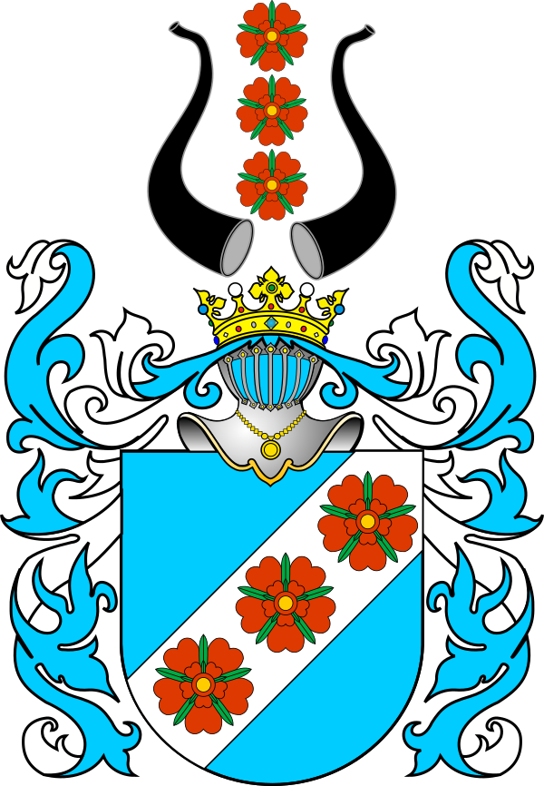 Центральная часть герба: три красные розы, состоящие каждая из четырёх (иногда пяти) листьев, расположенные на узкой белой перевязи, проведённой в голубом поле вправо. В нашлемнике между двумя трубами также три розы, расположенные вертикально одна под другой. Герб этот был пожалован одному витязю за отличие при крепости Ливе; роза же, как и всякий цветок в гербе воина, означает примирителя или избавителя от осады.