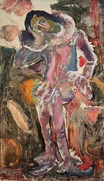На переднем плане полотна изображена в полный рост фигура человека в сиреневом старинном костюме с пышным круглым воротником-жабо. Лицо персонажа выражает грусть, его обрамляют иссиня-черные волосы. Правая рука поддерживает голову, которая сильно склонена на бок. Фон картины выполнен в серовато-черных тонах с включениями светлых и розовых пятен, что придаёт работе выразительную цветовую гамму.