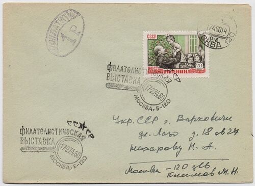 Штамп «Доплатить. 1 р» на конверте, отправленном в 1960 году из Москвы в Варковичи Ровненской области и франкированном 20-копеечной маркой СССР