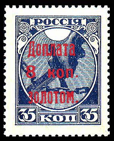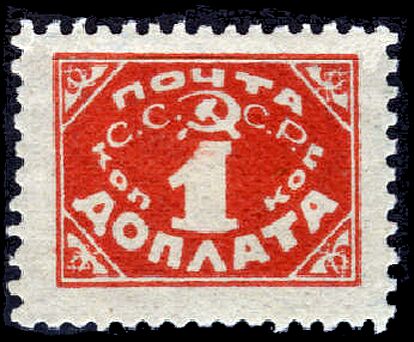 Первые советские доплатные марки девяти номиналов были выпущены 1 января 1924 года. На первых марках РСФСР с изображением руки с мечом, разрубающим цепь, сделали карминную (кирпично-красную) и оранжево-краснуюнадпечатку текста «Доплата» и нового номинала. Эти марки использовались только на Московском и Петроградском (Ленинградском) почтамтах до 30 апреля 1925 года[12][13].