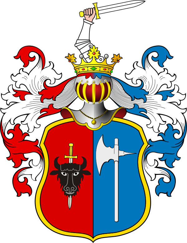 В щите раздвоенном с золотою окраиною, в правом красном поле голова зубра, пронзённая сверху мечом; в левом же голубом поле бердыш, остриём вправо.