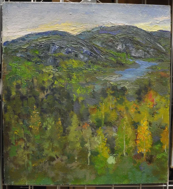 Картина представляет собой осенний пейзаж на холсте. Композиция выстроена по традиционной схеме с выделением переднего, среднего и дальнего планов. На переднем плане изображён желто-зелёный луг с группой камней. В среднем плане, сразу за лугом, расположены молодые деревья с желто-оранжевой листвой; справа — водоём, слева — дорога, уводящая к невысокому холму. Дальний план занимает ряд синих гор под серым небом. В нижнем правом углу холста поставлена подпись художника «suhin 02 г.».