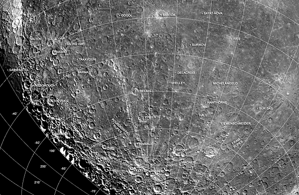 Согласно решению Международного астрономического союза кратеры на Меркурии называют в честь деятелей культуры: писателей, поэтов, художников, скульпторов, композиторов. Есть и исключения из этого правила — один кратер диаметром 60 км с лучевой системой назван в честь известного американского астронома Джерарда Койпера.