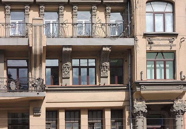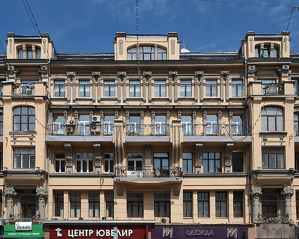 Пятиэтажное здание делилось на две части. На первых двух этажах находились магазины, а остальных трёх — жилые комнаты. На первом этаже работал магазин братьев Пате. Здесь продавались патефоны и фонографы. Также на первом этаже работала фотостудия «Отто Ренар». За этим домом, для товарищества Гиппус построил 4 доходных дома. Их квартиры сдавались в аренду[3][2].