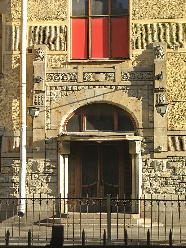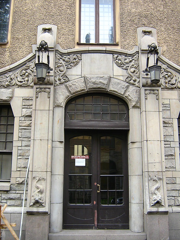 В оформлении фасадов широко использованы декоративные мотивы северного модерна: скульптурные рельефы с изображениями птиц, зверей и стилизованных растений. В центре рельефного украшения над центральным порталом — дата окончания строительства главной части комплекса (1902). Справа от даты изображена сосновая ветка с шишками, лесная птица и два зайца. Слева от даты — листья, голова рыси с раскрытой пастью и сова. На самом верху среднего щипца изображен горельефный филин с распростёртыми крыльями. На втором этаже по обе стороны корпуса расположены балконы с решётками в виде паутины с пауками, по сторонам решёток изображены подсолнухи. Остальные балконы здания имеют иную стилистику: часть из них выполнена в растительном варианте ритмического модерна, другие — в неоклассическом стиле. Кованые перила балкона первого этажа выполнены в виде буквы «L» (Lidvall). Над парадной левого корпуса находятся изображения фантастических рыб, напоминающих дельфинов. На выступающей части флигеля высечена ящерица, выше — голова рыси. Стены и парадные украшены рельефами, изображающими листья папоротника, мухоморы, сморчки, тюльпаны, подсолнухи, лесные ягоды, одна из парадных оформлена львиными масками.