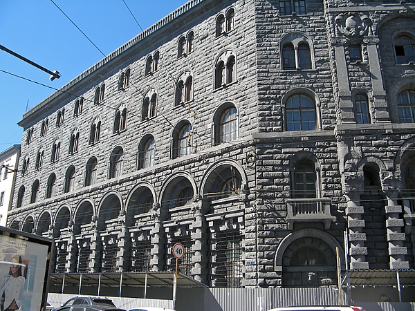 Архитектурный стиль здания определился временем. Было свойственно увлечение зодчеством раннего венецианского Возрождения. Лицевые фасады облицованы грубооколотым серым гранитом. Аркада второго этажа напоминает о венецианском Дворце дожей. Аркада первого этажа отличается особой внушительность и мощью. Оформление фасада (маскароны, барельефы, картуши, капители колонн и др.) выполнено скульпторами Л. А. Дитрихом и В. В. Козловым[1].