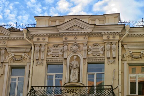 Трёхэтажный доходный дом построен в духе эклектики, в его оформлении сочетаются элементы необарокко, неорококо и неоклассицизма. Архитектурно-художественный облик здания определяют раскреповки и эркеры с шатровыми завершениями. Первый этаж оформлен рустом. Оконные проёмы декорированы разнообразными наличниками, на втором этаже они завершаются треугольными сандриками, а на третьем — прямоугольными. Фасад богато украшен лепными элементами, гирляндами, картушами и антаблементом[2]. В нише балкона третьего этажа установлена скульптура Гигеи, дочери античного врача Асклепия, с чашей и змеёй в руках работы Л. К. Шодкого[4].