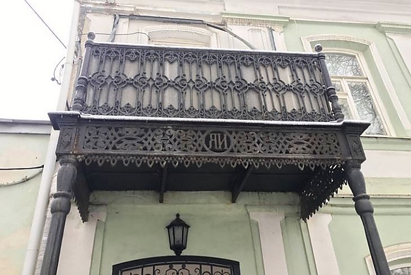 Украшением фасадов двухэтажных домов и архитектурными акцентами ансамбля усадьбы стали балконы на фигурных чугунных столбах с затейливым ажурным ограждением и с литыми чугунными инициалами купца «ЯИ», выполненными славянской вязью в нижней части балкона. Кованые балконы органично продолжали тему ворот, обрамлявших центральное одноэтажное здание: архитектор поместил балконы в крайние оси двухэтажных домов около центрального строения[3].