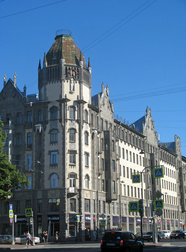 22 марта 1911 года Товарищество выкупило участок у Надежды Неёловой. По документам невыплаченный кредит на владении достигал почти 80 тыс. рублей. Погасив долг, компания пригласила возвести новый дом молодого архитектора Якова Блувштейна. Вероятно, он получил проект благодаря протекции Александра Лишневского[5]. Встроив уже существовавшее на участке каменное трёхэтажное здание в новый объём, он возвёл восьмиэтажный доходный дом в стиле северного модерна. Масштабное здание с девятью парадными получило два двора-колодца, площадь внутренних помещений составила более 20 тыс. м². Разрешение на ввод в эксплуатацию было выдано Отделом частновладельческого строительства городской Управы 5 ноября 1912 года. В здании были использованы самые современные на тот момент инженерные решения: проведена центральная канализация, водопровод, пылесос, установлены лифты и котельные водяного отопления. Внутренние помещения получили выразительную отделку — лепнину потолков, витражи, кафельные печи и камины. Арендаторам предлагалось два типа квартир — маленькие (от 100 до 160 м2) и «генеральские» (около 240 м²), выходящие окнами на перекрёсток и две улицы[6].