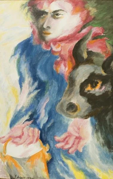 На бело-жёлтом фоне доминирует фигура женщины. Она одета в синее платье и розовый платок; в правой руке — бидон с молоком, вытянутый к зрителю. В правой части полотна изображена голова коровы.