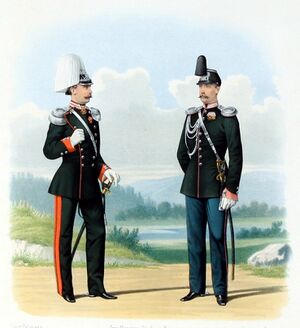 - ↑ Илл. 585. Штаб-Офицер л.-гв. Драгунского и Обер-Офицер (Адъютант) 2-го л.-гв. Драгунского Псковского Ея Величества полков. (вседневные формы) 2 Января 1874 // Перемены в обмундировании и вооружении войск Российской Императорской армии с восшествия на престол Государя Императора Александра Николаевича (с дополнениями) : Составлено по Высочайшему повелению / Сост. Александр II (император российский), илл. Балашов Петр Иванович и Пиратский Карл Карлович. — СПб.: Военная типография, 1857—1881. — Тетради 1—111 : (С рисунками № 1—661). — 47×35 см.
