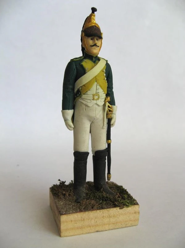 Скульптура выполнена в размерах 8×2,5 см и изображает солдата в полном боевом облачении. Фигура одета в тёмно-зелёный мундир с жёлтыми лацканами и отворотами длинных фалд. Дополняют образ тёмно-зелёные погоны с жёлтой выпушкой. Солдат одет в белый жилет, белые перчатки и штаны. На ногах надеты чёрные сапоги-ботфорты. Головной убор представлен медной каской с гребнем и плюмажем из чёрных конских волос. На поясе закреплён палаш в ножнах. Скульптура установлена на квадратной деревянной подставке.