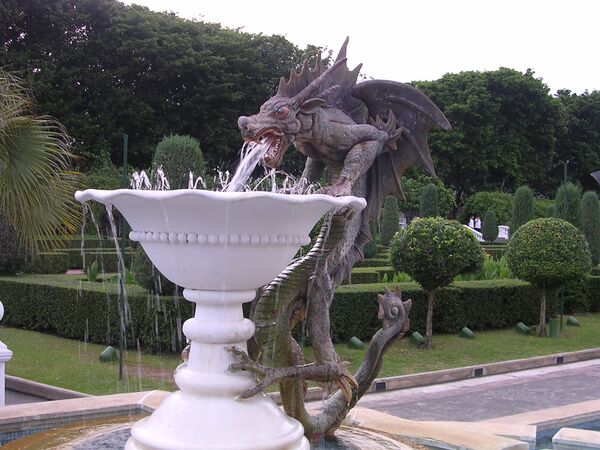 Драконы часто украшают тематические парки. Например, «Драконий фонтан» открывал вход в сингапурский парк Fountain Gardens, построенный в 1989 году. В 2007 году парк вместе с драконьей скульптурой был снесён ради строительства Resorts World Sentosa. Воздух над парком Disney World украшает парамотор, изображающий огнедышащую виверну[34]. Аналогичный персонаж из мира Гарри Поттера восседает на крыше здания в Diagon Alley в парке Universal Studios Florida.