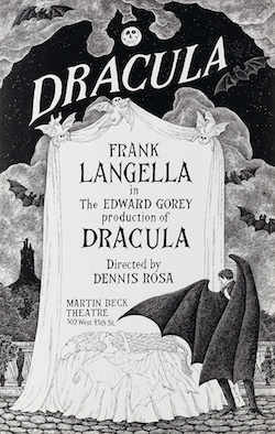 В 1973 году продюсер Джон Вулп поставил пьесу в Nantucket Stage Company в Нантакете, штат Массачусетс. Он попросил Эдварда Гори, иллюстратора, известного своими макабрическими, сюрреалистическими образами, разработать декорации и костюмы. Гори, который никогда раньше не работал в театре, создал в основном чёрно-белый дизайн с акцентом на красный цвет. Режиссёром выступил Деннис Роза, а роль Дракулы исполнил Ллойд Баттиста. Впоследствии Вулп перенёс постановку во внебродвейский театр «Черри Лейн» в Нью-Йорке[18].