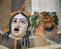 Римляне унаследовали театральную культуру Древней Греции; начиная с 240 г. до н. э. спектакли игрались в дни больших праздников — трагедии и комедии, а с I в. до н. э. — ателланы; позже широкое распространение получили мимы и пантомимы[6]. В римском театре лишь в эпоху империи появились маски; в отличие от греков, римляне использовали парики[6].