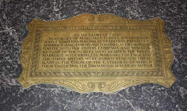 Известно, что в 1501 году Маргарет Драммонд умерла от пищевого отравления вместе со своими сёстрами Ефимией и Сибиллой, находясь в замке Драммонд[11]. Как правило, заявления об отравлении, сделанные в отношении исторической личности, умершей после внезапной болезни, следует рассматривать с осторожностью, но в этом случае, когда три человека, предположительно, умерли вскоре после того, как съели одну и ту же пищу, следует принять современное суждение. В то время это не вызывало особых подозрений; стандарты гигиены пищевых продуктов вряд ли были тогда высокими, и случаи непредумышленного пищевого отравления происходили в любой период.