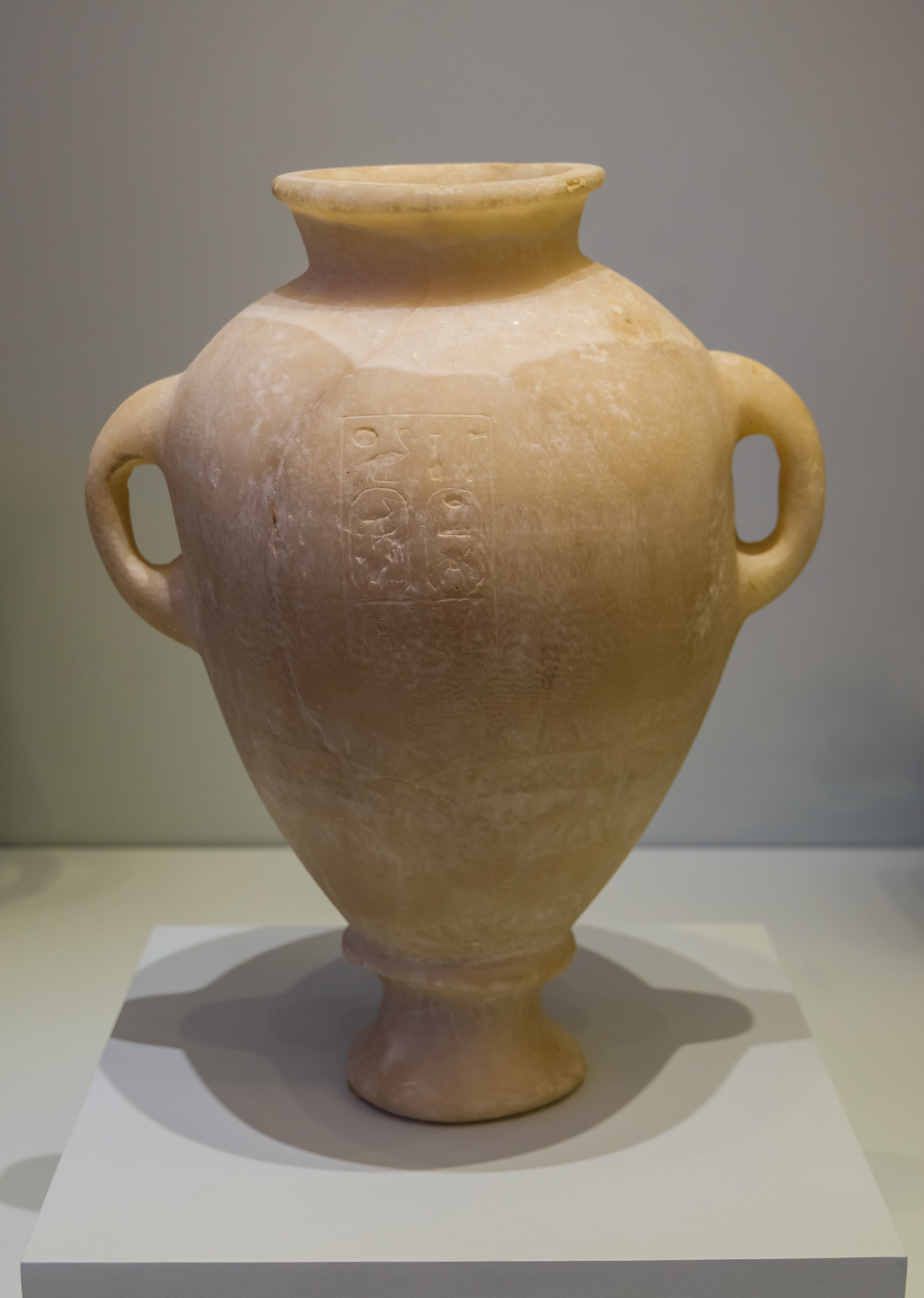 Египетская алебастровая амфора, найденная в Кацамбас-Поросе, Крит, 1400—1375 гг. до н. э. На ней вырезаны иероглифические надписи с именем фараона Тутмоса III (1479—1425 гг. до н. э.) в двух картушах. «Добродетельный бог Мен-Гепер-Ре, сын Солнца, Тутмос, справедливый в преобразованиях, наделённый вечной жизнью». Археологический музей Ираклиона