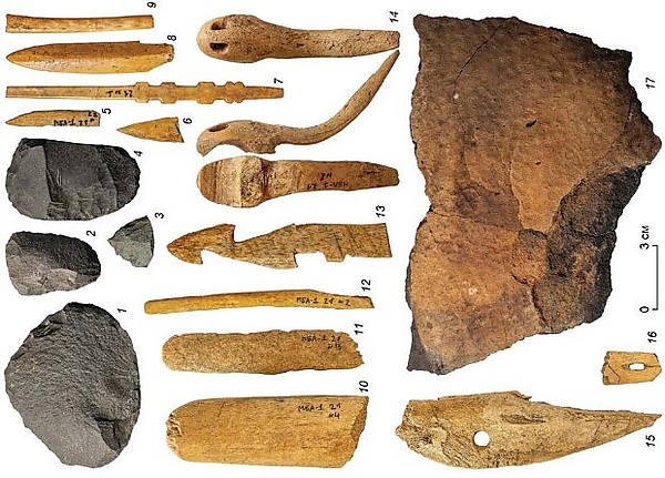 Несмотря на то, что древнекорякская культура связывается с предками коряков, ее могильники имели специфические особенности (погребения в расщелинах отвесных скал). Из артефактов обнаружены костяной лук из рога северного оленя и деревянная ложка. Также известны каменные (базальтовые и кремневые) скребки для обработки шкур, а также фрагменты керамики с шнуровым орнаментом. В быту также использовались изделия из бересты[2].